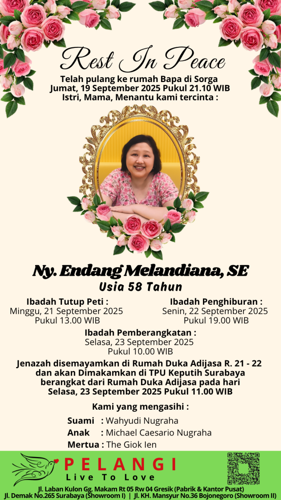 Berita Duka – Ny. Endang Melandiana, SE Nama : Ny. Endang Melandiana, SE Tanggal Lahir : 31 – Oktober – 1967 Tanggal Kematian : 19 – September – 2025 Usia : 58 Tahun Disemayamkan : Rumah Duka Adijasa Surabaya R. 21-22 Dikebumikan/diperabukan : TPU Keputih Surabaya