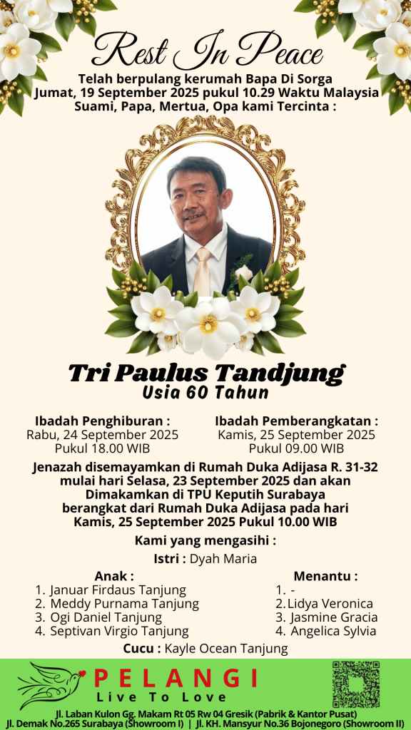 Berita Duka – Tn. Tri Paulus Tandjung Nama : Tn. Tri Paulus Tandjung Tanggal Lahir : 03 – Oktober – 1965 Tanggal Kematian : 19 – September – 2025 Usia : 60 Tahun Disemayamkan : Rumah Duka Adijasa Surabaya R. 31-32 Dikebumikan/diperabukan : TPU Keputih Surabaya