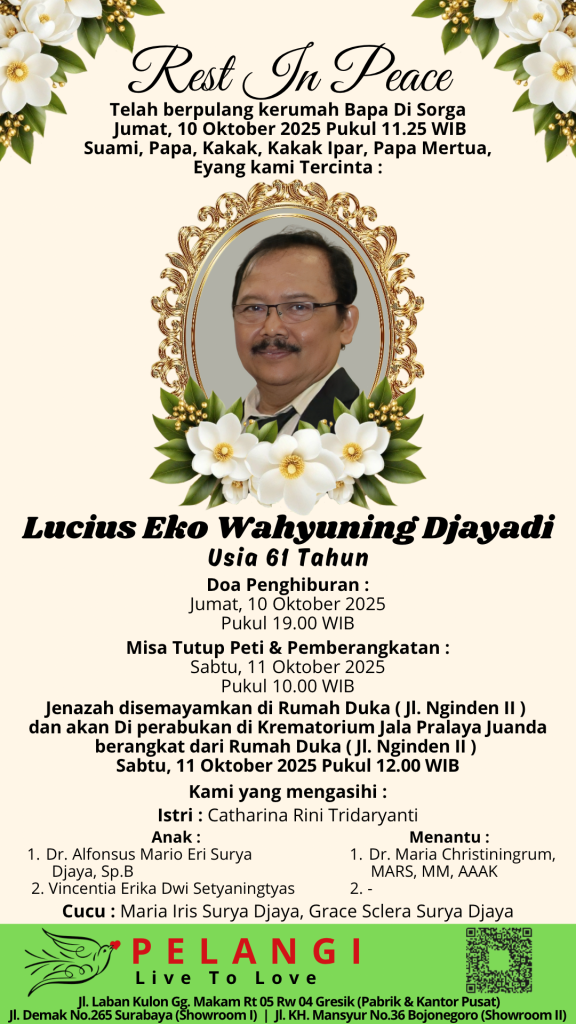 Berita Duka – Tn. Lucius Eko Wahyuning D. Nama : Tn. Lucius Eko Wahyuning D. Tanggal Lahir : 29 – Oktober – 1963 Tanggal Kematian : 10 – Oktober – 2025 Usia : 61 Tahun Disemayamkan : Rumah Duka (Jl. Nginden II) Dikebumikan/diperabukan : Krematorium Jala Pralaya Juanda