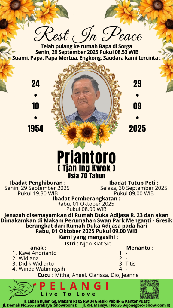 Berita Duka – Tn. Priantoro Nama : Tn. Priantoro Tanggal Lahir : 24 – Oktober – 1954 Tanggal Kematian : 29 – September – 2025 Usia : 70 Tahun Disemayamkan : Rumah Duka Adijasa Surabaya R. 23 Dikebumikan/diperabukan : Makam Perumahan Swan Park Menganti-Gresik