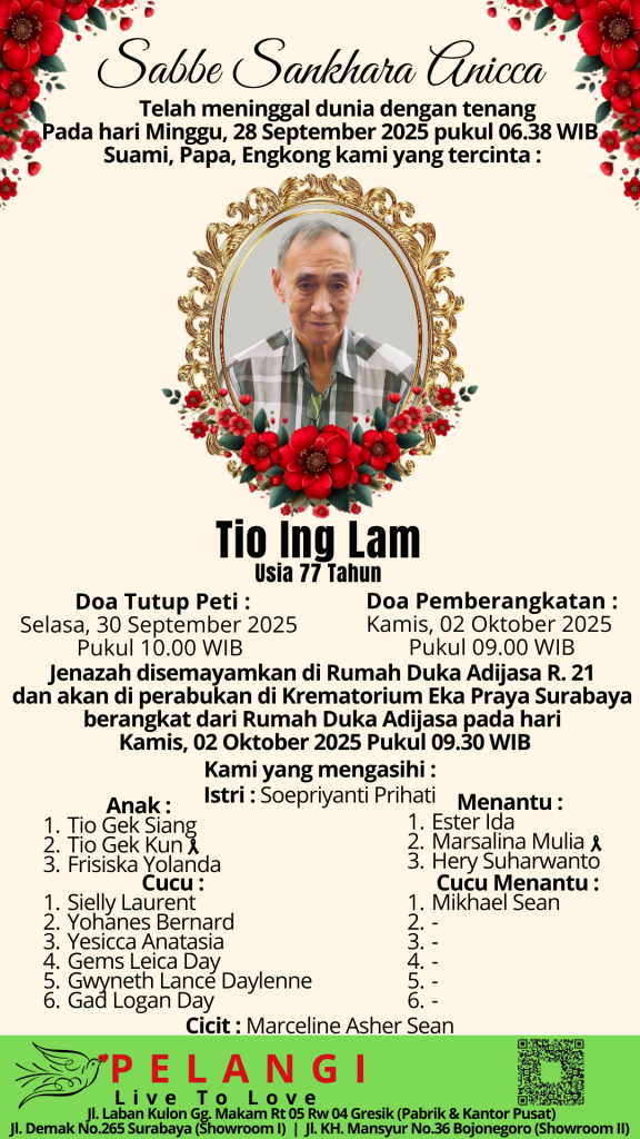 Berita Duka – Tn. Tio Ing Lam Nama : Tn. Tio Ing Lam Tanggal Lahir : – Tanggal Kematian : 28 – September – 2025 Usia : 77 Tahun Disemayamkan : Rumah Duka Adijasa Surabaya R. 21 Dikebumikan/diperabukan : Krematorium Eka Praya Surabaya