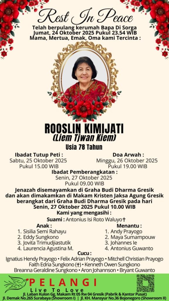 Berita Duka – Ny. Rooslin Kimijati Nama : Ny. Rooslin Kimijati Tanggal Lahir : – Tanggal Kematian : 24 – Oktober – 2025 Usia : 78 Tahun Disemayamkan : Graha Budi Dharma Gresik Dikebumikan/diperabukan : Makam Kristen Jaksa Agung Gresik