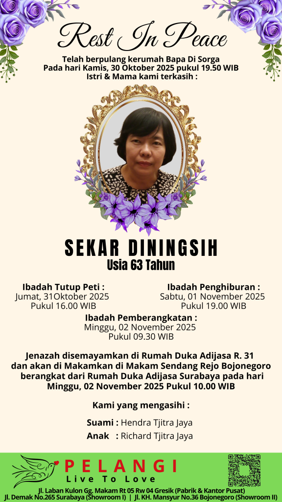 Berita Duka – Ny. SEKAR DININGSIH Nama : Ny. Sekar Diningsih Tanggal Lahir : – Tanggal Kematian : 30 – Oktober – 2025 Usia : 63 Tahun Disemayamkan : Rumah Duka Adijasa R. 31 Dikebumikan/diperabukan : Makam Sendang Rejo Bojonegoro