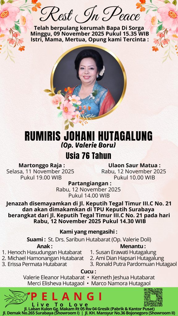 Berita Duka – Ny. Rumiris Johani Hutagalung Nama : Ny. Rumiris Johani Hutagalung Tanggal Lahir : – Tanggal Kematian : 09 – November – 2025 Usia : 76 Tahun Disemayamkan : Rumah Duka Jl. Keputih Tegal Timur Dikebumikan/diperabukan : TPU Keputih Surabaya